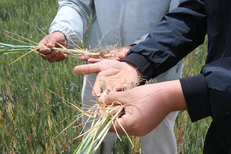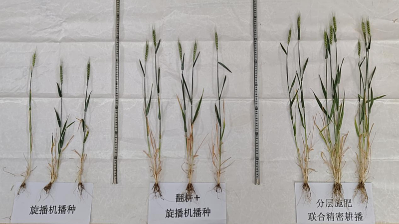 “今年干旱,去年同时段下播的小麦,现在差距一目了然。”马正跃指着身侧左右两块差异明显的麦田说完,又分别拔出来一簇小麦,拿在手中从根到穗对比,“你看,普通农机种下的小麦没有毛根,叶子都发黄打卷,麦穗短小干瘪。但用新农机播种的小麦受旱较轻,根系更长,麦穗更大,根部发黄叶片较少。”