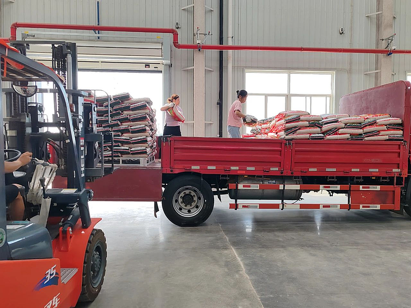 卡车正陆续装货,车灯在渐浓的暮色里拉出一道道金色轨迹,载着饱满的种子,正待驶向秋播的田野。