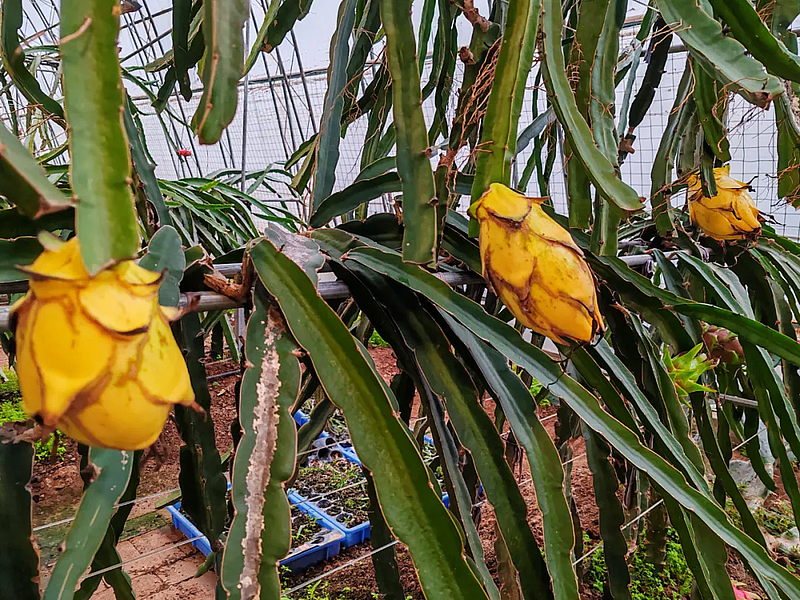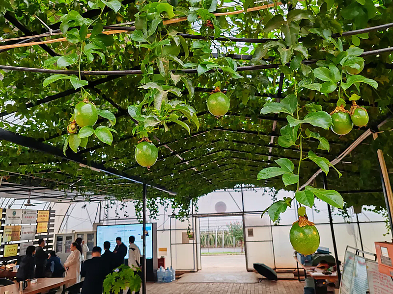 秋意正浓,瓜果飘香。秋阳洒在杨凌青皮她园火龙果种植基地的双拱双膜大棚上,折射出科技农业的亮色。作为第32届杨凌农高会田间展的“明星打卡点”,这里没有传统农田的“面朝黄土”,取而代之的是智能传感器闪烁的微光、LED补光灯交织的暖芒,以及“秦红龙”“新双色”火龙果缀满枝头的丰景——一场“南果北种”的农业新实践,正在此生动上演。