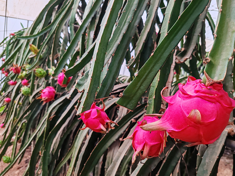 农高会的平台效应,让青皮她园的朋友圈越扩越大。展馆与田野同频共振,让技术“可见、可触、可互动”,让农业真正“鲜活”起来。展厅里,鲜果、NFC鲜榨果汁、果酒等全产业链产品琳琅满目;基地中,火龙果、荔枝、莲雾等热带作物与榴莲试种区相映成趣,更专门设有海南万宁300亩榴莲基地的品种展示。2024年农高会期间,仅田间展就实现40多万元创收,陕西神木客户现场签下14万元种苗订单。如今,基地已拥有20余种火龙果种质资源,年产鲜果500吨,亩均产值突破10万元。