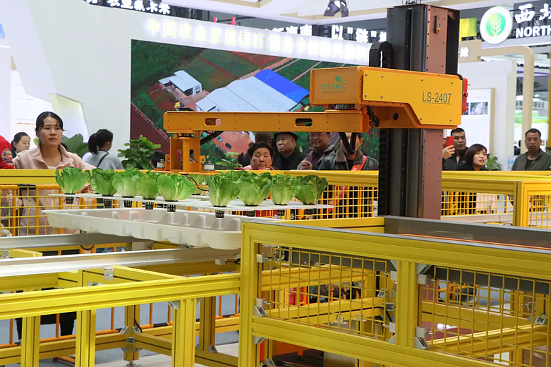 “现场空间有限,我们把C位留给了‘最硬核’的主角——全自动植物工厂。”珠海益品农业科技有限公司总监欧娟爱一句话把观众视线拉向高耸的立体栽培架:AGV小车穿梭送苗、机械臂轻柔采收,全程无人。她介绍,公司自2016年起便深耕于植物工厂自动化领域,已迭代至第三代全自动化方案,均已在江西、黑龙江、四川及海外多国落地,“连小朋友都看得目不转睛,这就是智能制造的魅力。”