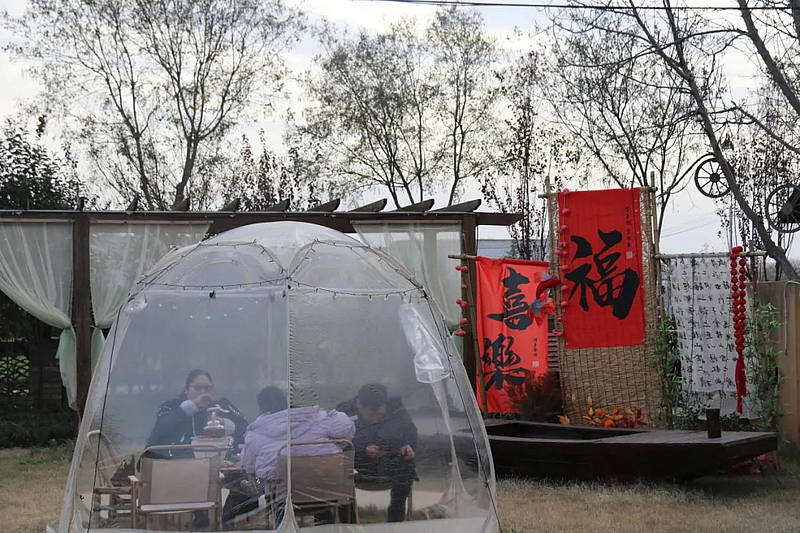 “小院自今年9月升级改造后,这样的好评每天都能听到。节假日客流量能达到200多人,效益明显提升。”艺舍别院主理人党焕维介绍,冬季庭院新增泡泡屋、红气球等打卡点,旧门板、陶片等乡土元素融入现代审美,就连餐具都印着“福”字……这座乡村民宿仿佛在告诉每个人,田西村就是村民和游客的幸福归宿。