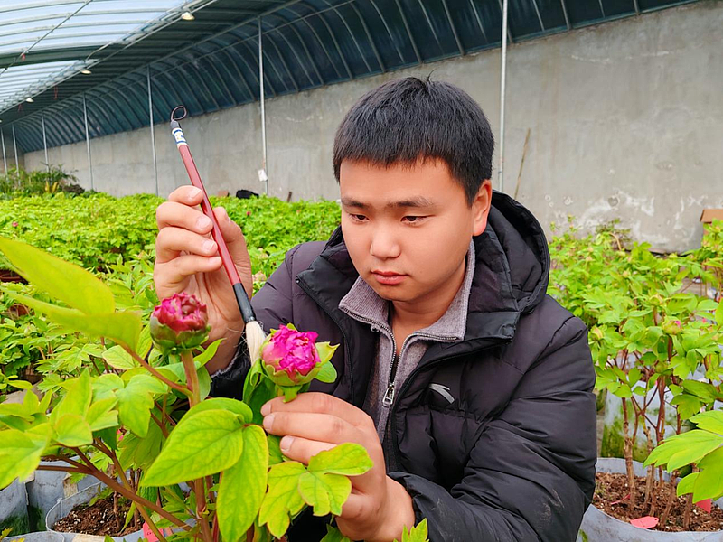 在西北农林科技大学教授张延龙的技术指导下,这位年轻的新农人打破牡丹“谷雨开花”的自然规律,摸索出冷库春化、大棚加温、精准调控的成熟催花技术,让国色天香在寒冬腊月准时绽放,成为春节市场的抢手佳品。