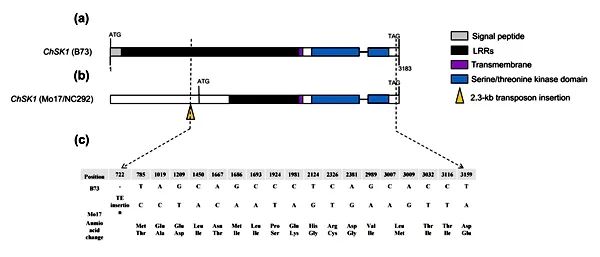 玉米对小斑病的抗性是由多基因控制的复杂数量性状。前期研究发现,位于第3号染色体bin3.04的QTL- qSLB3.04 是一个玉米小斑病的隐性抗病位点。该研究利用图位克隆、候选基因关联分析、表达分析等发现ChSK1是qSLB3.04位点的感病基因,其编码一个LRR-RK蛋白。抗病亲本Mo17和NC292在ChSK1的第一个外显子上存在一个2344-bp的Harbinger-like转座子插入,导致基因失活(图1)。玉米NAM群体ChSK1等位基因分析发现,抗病材料中存在更多的变异类型,但不包含转座子插入,暗示不同抗病等位基因可能存在独立的进化模式。