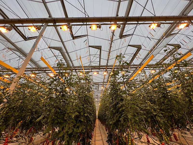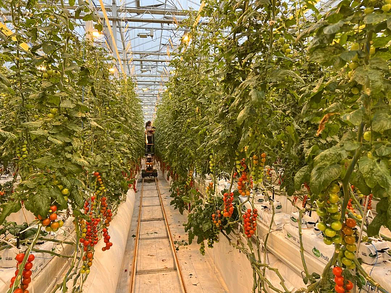 走进杨凌智慧农业示范园的智能温室,记者看到,一排排翠绿的藤蔓映入眼帘,放眼望去,一颗颗饱满的番茄掩映在绿叶下,娇艳诱人,空气中散发着淡淡的香气。现场的工作人员正在进行修剪、打理工作,宽敞明亮的温室与室外乍暖还寒的初春形成了鲜明对比。