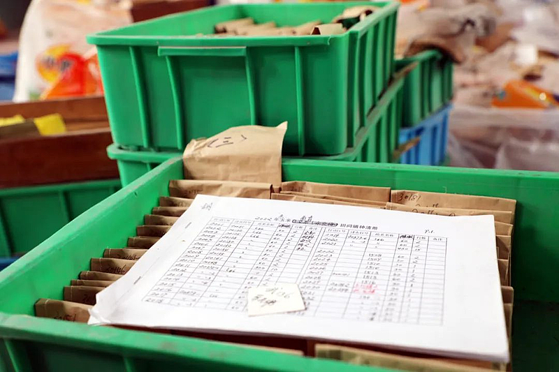 只见胡老熟练地一边整理装袋一边编号,他告诉记者,袋子上的每一串数字就像出生证明一样,可以追溯到它的“亲生父母”。