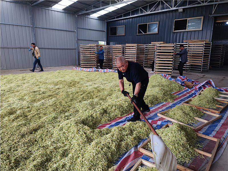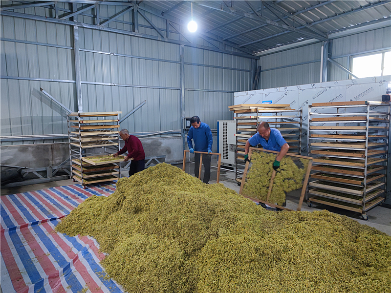 走进基地的加工厂房,机器声轰鸣,分拣、晾晒、上架、烘干、包装……经过几道工序,一箩箩淡黄色的金银花被村民们从烘干机里推出,再堆成一座高高的“金银山”。