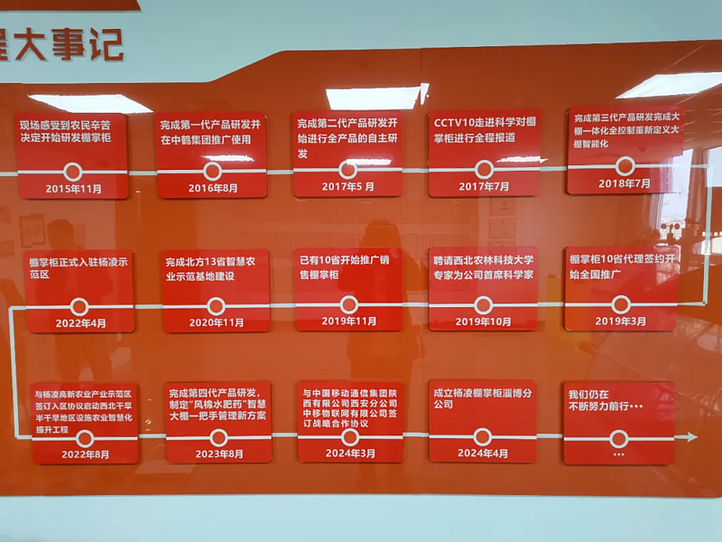 在位于杨凌上合农业国际贸易港的杨凌棚掌柜信息科技有限公司产品展厅,文化墙上代表企业发展历程企业大事记格外醒目:2019年,农高会平台结缘并聘请西农大专家为公司首席科学家;2022年4月棚掌柜正式入驻杨凌示范区;2022年8月,与杨凌签订入区协议启动西北干旱半干旱地区设施农业智慧化提升工程;2023年8月,完成第四代产品研发,制定“风棉水肥药”智慧大棚一把手管理新方案……