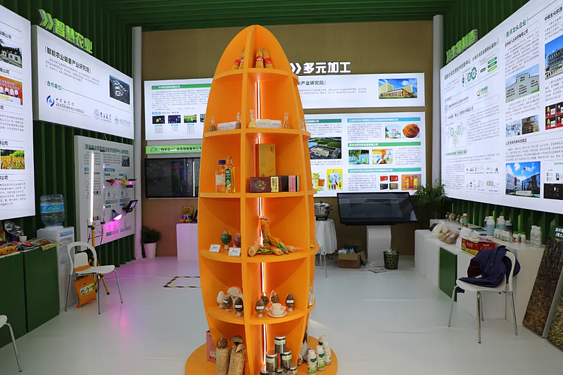 走进长春农高区专题展,一个硕大的玉米造型的展示架映入眼帘,上面摆满了玉米新品种、鲜食玉米以及玉米须茶、玉米油和玉米饲料、有机肥等产品。