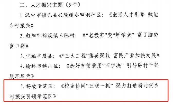 日前,省委农村工作领导小组组织开展了第三批全省乡村振兴典型案例征集活动,经市县推荐、省级复审、专家评审、了解核查、公开公示等程序,共评选出49个典型案例,在全省进行推介宣传。其中,杨凌示范区推荐的《校企协同“五联一抓”聚力打造新时代乡村振兴引领示范区》获评人才振兴主题典型案例。