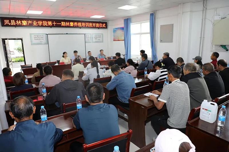 采访当天,在凤县平林镇政府综合文化站培训室,第十一期林麝养殖技能培训班正式开班,来自凤县林麝产业学院、陕西农林职业技术大学和西北农林科技大学专家团队正在讲解林麝常见疾病的症状与应对方法。这样的培训每年举办4次,并形成了凤县独具特色的劳务品牌——“凤县麝工”。