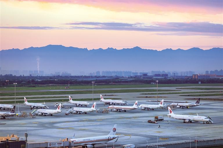 3月20日,西安咸阳国际机场停机坪上停满了客机。预计今年下半年,T5航站楼将建成投用,届时整个机场的年旅客吞吐量将达8300万人次。