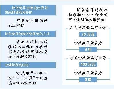 在激励支持方面,事业单位在核定的绩效工资总量内,可自主确定专门用于技术转移转化人员薪酬分配的绩效工资部分,自主设立符合本单位技术转移转化工作特点、岗位价值的薪酬项目。事业单位聘用的技术转移转化高层次人才所需绩效工资总量实行单列。在各级各类人才项目及人才类评比表彰项目中,向从事技术转移转化工作的人才倾斜。符合条件的技术转移转化人才和企业可申请创业担保贷款,个人贷款最高可申请30万元,贷款期限最长为3年;企业贷款最高可申请400万元,贷款期限最长为2年。