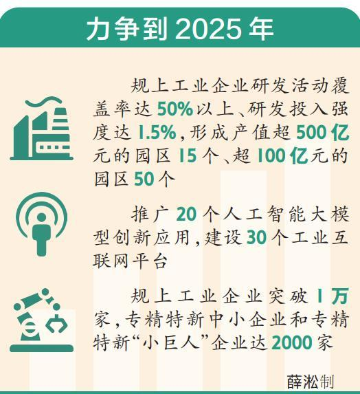 《实施方案》提出“七个强化”,制定20项具体举措,推动重点任务落地见效。强化链主企业领航作用,发挥链主企业集聚带动作用,推动链主企业与配套企业协同发展;强化“链长制”工作机制,夯实工作专班责任;强化产业平台创新赋能,力争到2025年,规上工业企业研发活动覆盖率达50%以上、研发投入强度达1.5%,形成产值超500亿元的园区15个、超100亿元的园区50个;强化数智赋能绿色转型,力争到2025年,推广20个人工智能大模型创新应用,建设30个工业互联网平台;强化经营主体培育,力争到2025年,规上工业企业突破1万家,专精特新中小企业和专精特新“小巨人”企业达2000家;强化政策支撑和资源要素供给,发挥财税金融政策效能,提升资源保障水平,建设高素质人才队伍;强化工作保障,健全工作协调推进机制,建立完善统计监测制度,完善安全风险防范体系,建立综合评价机制。
