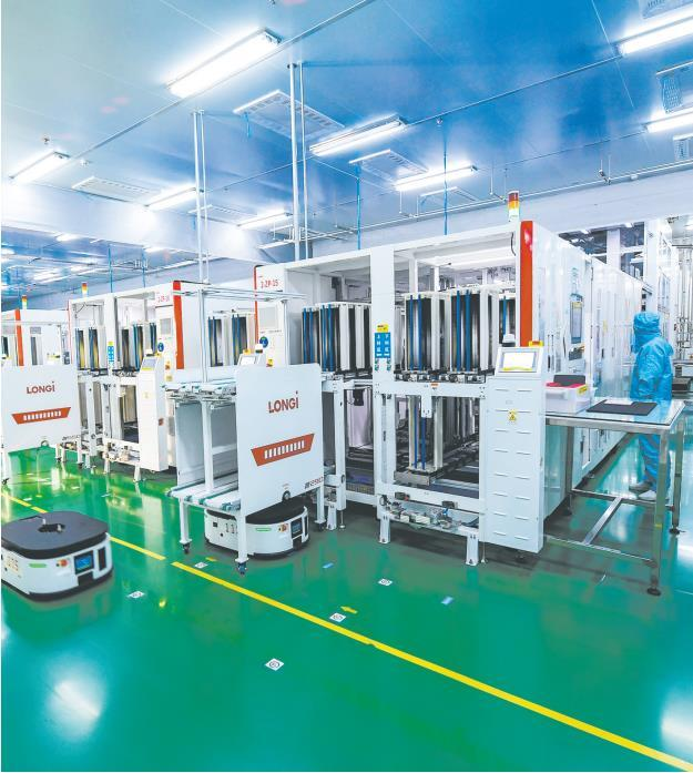 陕西隆基乐叶光伏科技有限公司车间内,工作人员在查看设备运行情况(资料照片)。 本报记者 袁景智摄