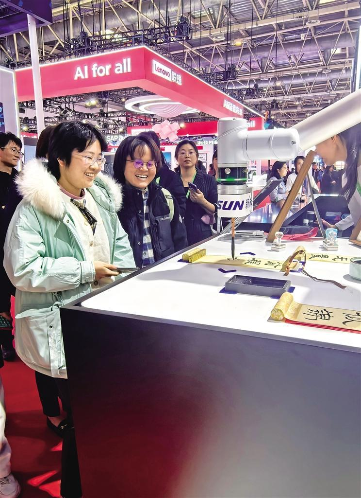 11月27日,陕西美光智能科技有限公司展位上的全自动书写毛笔字机械臂吸引观众驻足观看。