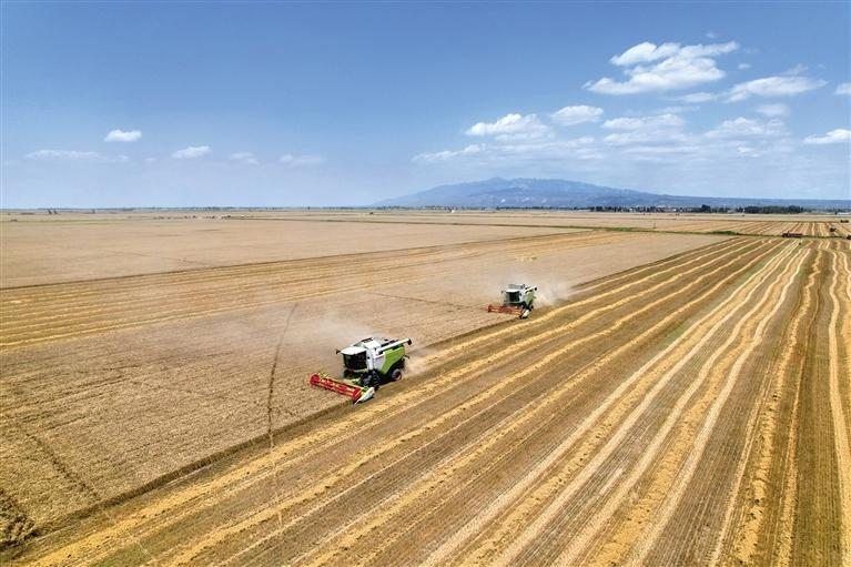 联合收割机在渭南市大荔县赵渡镇赵东村的麦田作业(资料照片)。本报记者 陈宏江摄
