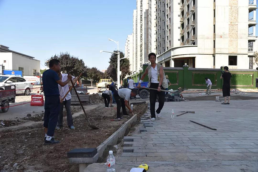 8月9日下午四时,杨陵街道党工委书记陈团江和杨陵区市政园林绿化有限责任公司董事长崔创军正在现场指导道路铺设工作。“我们街道办和城管执法局等单位现场主动认领任务,立下‘军令状’,三天要把这条道路全面贯通,对剩余地块铺设地砖,今天已经是第三天,目前基本已经完成。”杨陵街道党工委书记陈团江告诉记者。