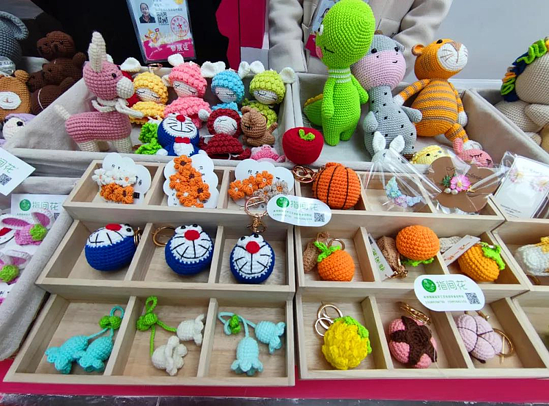 “这个针织的白菜钥匙扣也太可爱了,还有这个橙色的毛线柿子,代表着事事如意,不但好看,而且寓意也很好,挂在钥匙串上刚刚好。”在永寿指尖花工艺农民专业合作社的展位前,一个个小巧精致的小饰品吸引了几位女孩子的视线,她们爱不释手地挑选着心仪的展品。