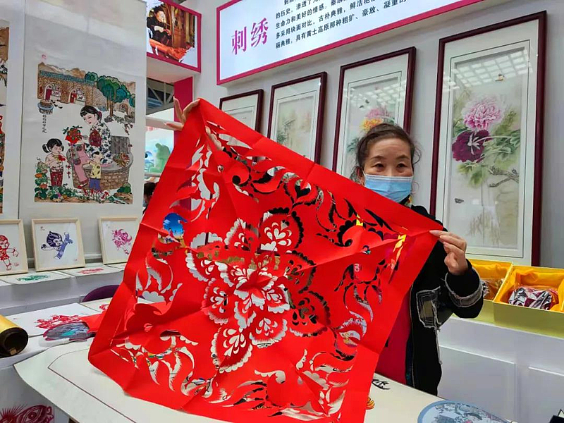 同样引人注目的还有陕北婆姨剪纸。在榆林市陕北婆姨文化产业股份有限公司董事长曹宏霞的巧手下,十四运会四个可爱的吉祥物跃然纸上,还有很多与陕北民俗、民情、民歌有关的剪纸得到了参会群众的喜爱。曹宏霞说:“我们的剪纸销往全国各地,我还曾经去德国,在中德文化交流会上展示我们的陕北婆姨剪纸。今年是我第六次来农高会,希望通过这个平台,让更多人感受到剪纸这门手工艺的魅力。”