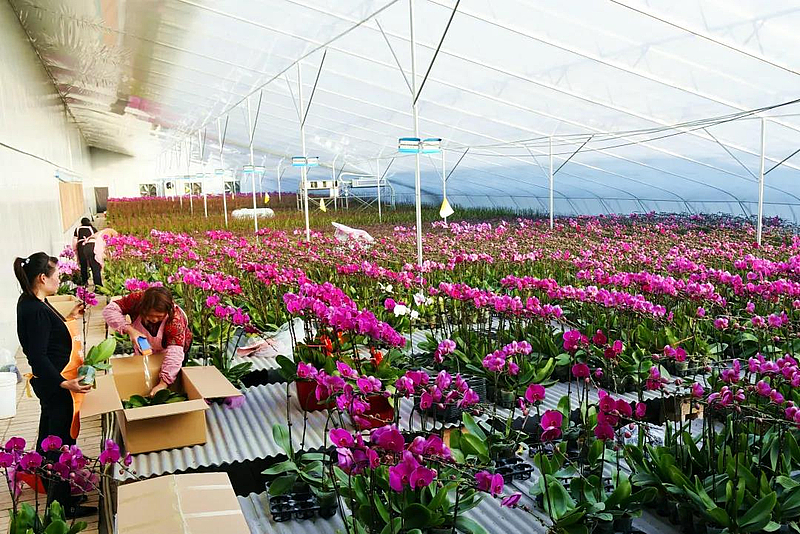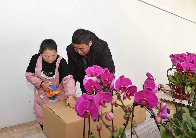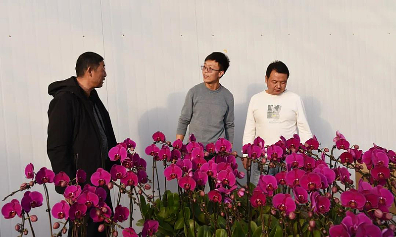三方的合作,不仅为村集体带来了蝴蝶兰种植技术,就连销路也有了保障。说话间的功夫,甘肃平凉的客户袁菲就开车来到基地准备拉货。“我感觉咱们这边的蝴蝶兰花大、花节长,花的颜色更艳一些,花期也长,在当地很受市场欢迎,今年到目前为止,我已经来这里20多次了,每次都要来拉200株左右的蝴蝶兰。”
