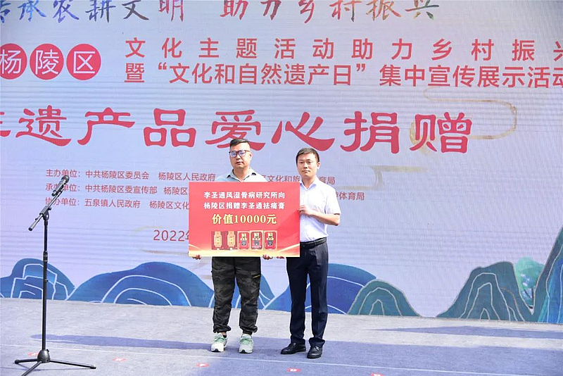 启动仪式上,对杨陵区2022年主题文化活动助力乡村振兴工作进行了安排,相关负责人介绍了杨陵区非物质文化遗产保护情况,并现场为杨陵区第一批、第二批区级非遗项目代表性传承人授牌;区级非遗项目李圣通祛痛膏传承人现场向环卫工人和王上村群众进行了爱心捐赠。