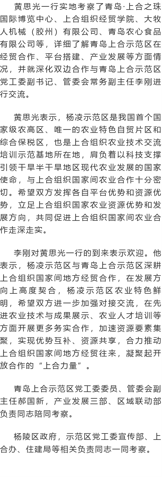 3月24日,杨凌示范区党工委书记黄思光一行赴青岛中国—上合组织地方经贸合作示范区考察。青岛上合示范区党工委副书记、管委会常务副主任李刚等陪同。