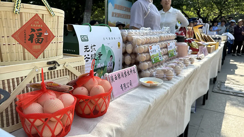 在袁媛鸡蛋的展位上,包装精美的鸡蛋吸引了不少人驻足观看,负责人袁书鹏表示:“我们的鸡蛋可不一样哦!它们是经过科学配比,纯谷粮喂养的,不仅口感鲜美,而且富含各种维生素和矿物质,对身体健康非常有益。”