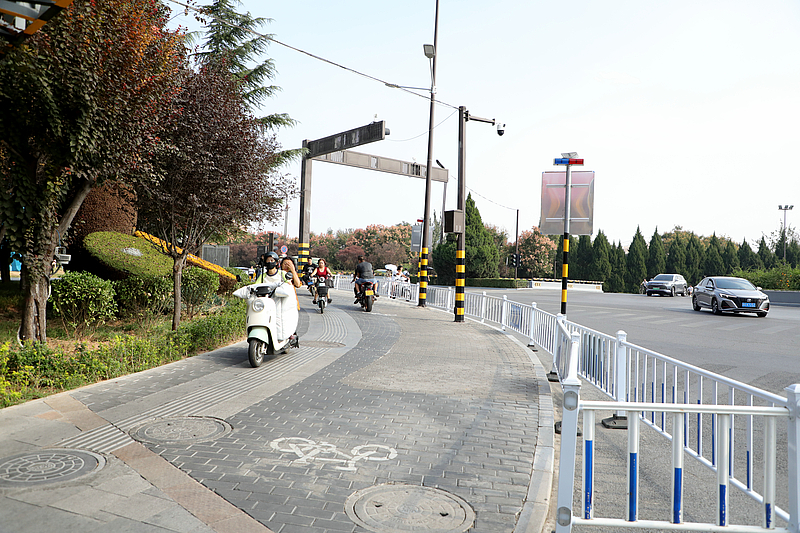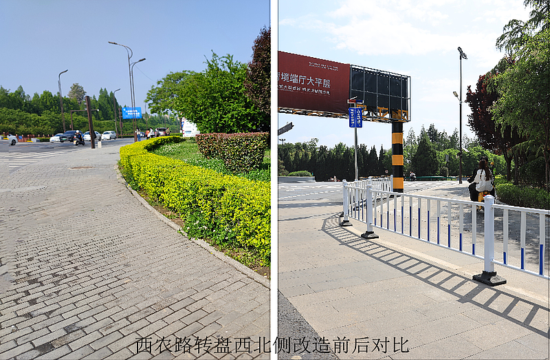 西农路立交桥南口,也是城区的易堵点,没有改造前,机动车辆、非机动车辆和行人交错通行,斑马线靠近涵洞,不仅通行不畅,交通事故风险也相对较大。此次改造不仅在拐弯处开辟了非机动车道,实行机动车、非机动车分离行驶,还将斑马线向南迁移,大大缓解了交通压力,减少了发生交通事故的频率。