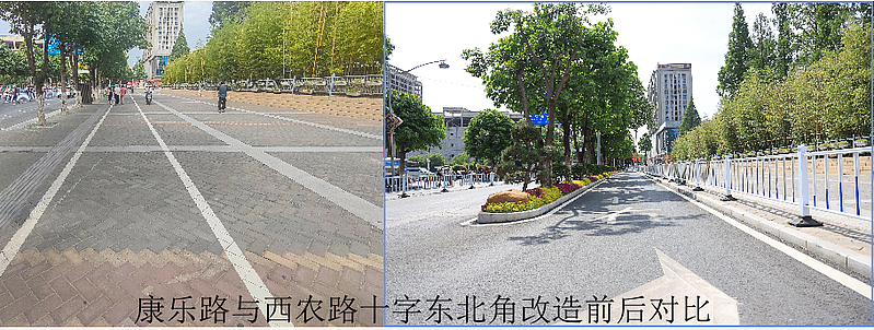 去老城区比较少的群众,近日再来街道,对街道的变化无不感到惊讶:西农路与康乐路十字路口西北向、东北向及东南向各增加了一条右转专用道,机动车非机动车分离行驶,化建停车场出入口进行了优化,人行道进行了升级,路灯杆、交通信号灯、护栏等市政设施设置也更加科学,夜间的灯光变得美轮美奂……