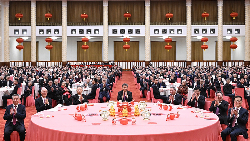 人民大会堂宴会厅灯光璀璨、喜气洋洋,各界人士齐聚一堂、共迎新春,现场洋溢着欢乐祥和的节日气氛。