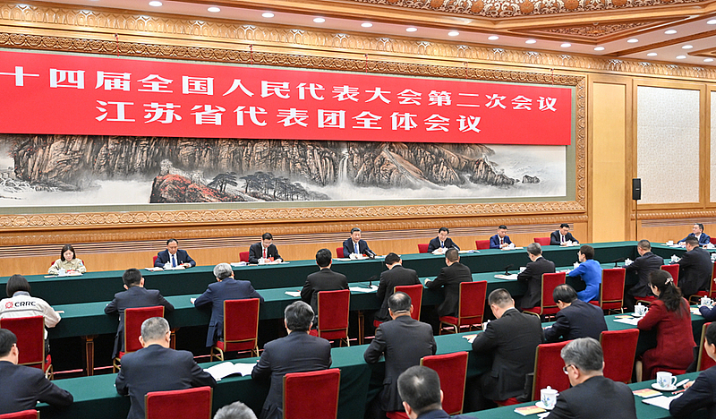 3月5日,中共中央总书记、国家主席、中央军委主席习近平参加他所在的十四届全国人大二次会议江苏代表团审议。新华社记者 鞠鹏 摄