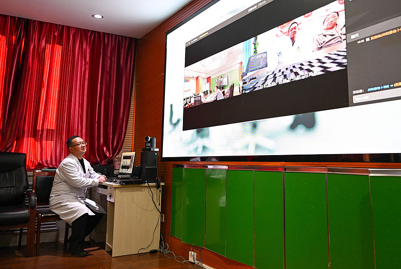 2024年12月17日,在青海省海南藏族自治州共和县中医院,医生与乡镇卫生院连线进行远程会诊。新华社记者 张龙 摄