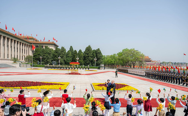 4月23日上午,国家主席习近平在北京人民大会堂同来华进行国事访问的阿塞拜疆总统阿利耶夫举行会谈。这是会谈前,习近平在人民大会堂东门外广场为阿利耶夫举行欢迎仪式。新华社记者 翟健岚 摄