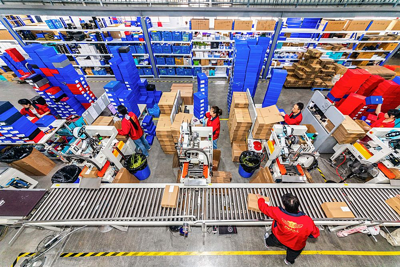 2025年4月20日,在位于浙江省温州市的德赛集团物流园内,工作人员在对发货的鞋类产品进行分拣、打包。新华社发(刘吉利摄)