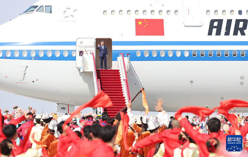 新疆维吾尔自治区党委书记陈小江、自治区人民政府主席艾尔肯·吐尼亚孜、自治区人大常委会主任祖木热提·吾布力、自治区政协主席努尔兰·阿不都满金、新疆生产建设兵团政委何忠友等在舷梯下迎候。习近平走下舷梯时,少先队员献上鲜花。各族群众代表身着民族服饰,载歌载舞,欢迎总书记的到来,表达对总书记的衷心祝福。