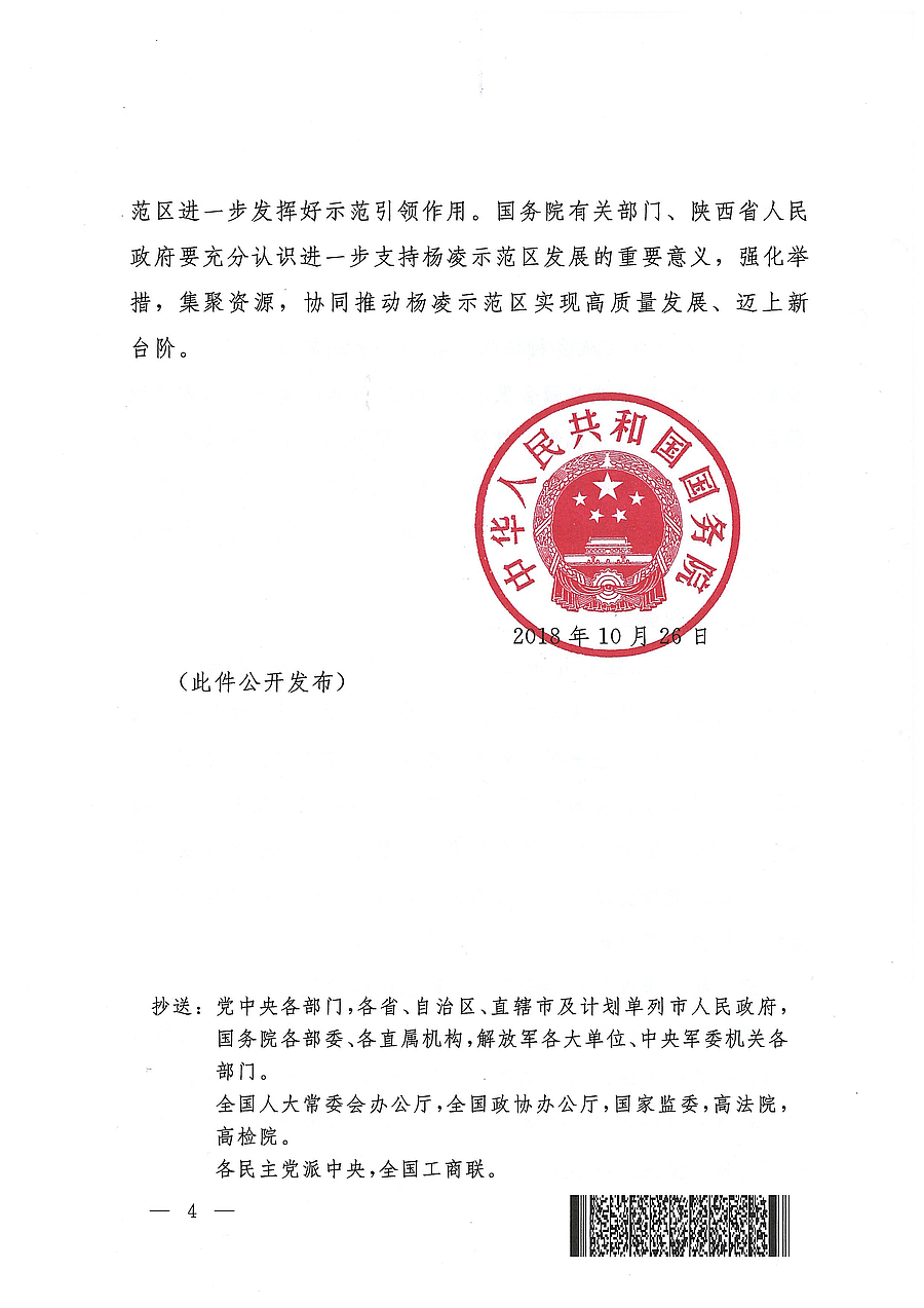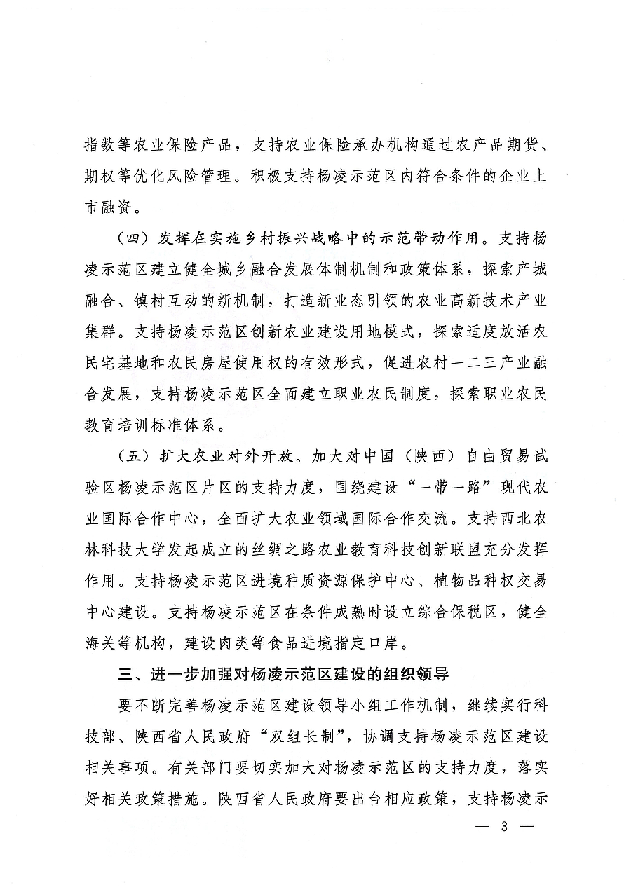 要不断完善杨凌示范区建设领导小组工作机制,继续实行科技部、陕西省人民政府“双组长制”,协调支持杨凌示范区建设相关事项。有关部门要切实加大对杨凌示范区的支持力度,落实好相关政策措施。陕西省人民政府要出台相应政策,支持杨凌示范区进一步发挥好示范引领作用。国务院有关部门、陕西省人民政府要充分认识进一步支持杨凌示范区发展的重要意义,强化举措,集聚资源,协同推动杨凌示范区实现高质量发展、迈上新台阶。