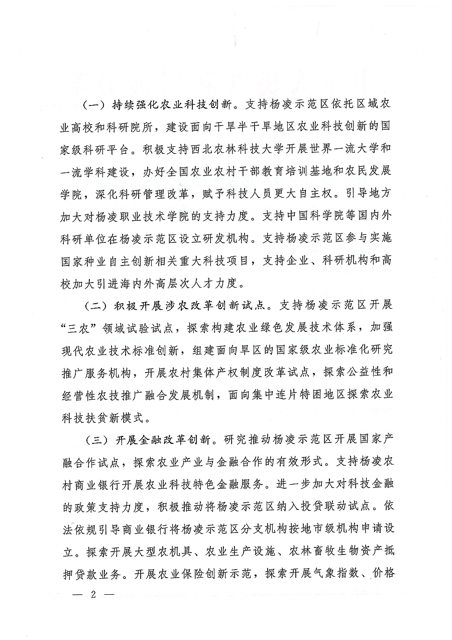 (二)积极开展涉农改革创新试点。支持杨凌示范区开展“三农”领域试验试点,探索构建农业绿色发展技术体系,加强现代农业技术标准创新,组建面向旱区的国家级农业标准化研究推广服务机构,开展农村集体产权制度改革试点,探索公益性和经营性农技推广融合发展机制,面向集中连片特困地区探索农业科技扶贫新模式。