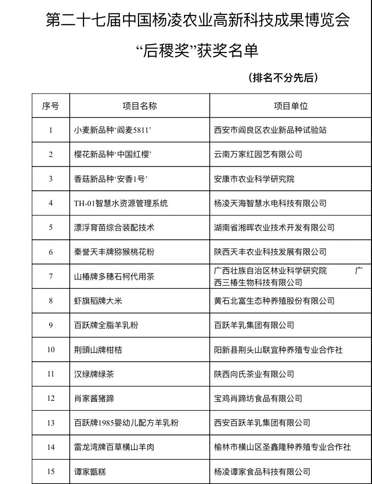 据了解,“后稷奖”从1994年杨凌农高会创办开始设立,至今已连续成功进行了27次评审,累计遴选出的获奖奖项2800多项。在获奖的项目中,既有新技术、也有新产品,既有企业的,农民合作社的,还有科研单位的。这些新技术、新产品,在农业科技成果产业化、品牌化方面发挥了重要的促进作用,产生了显著的经济社会效益。