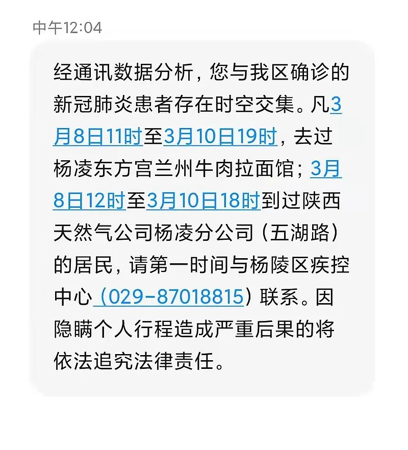 近期,有不少市民先后收到杨陵区疫情防控指挥部的提示短信,被告知与新冠确诊病例同时空伴随,要求在收到短信之日起,第一时间与杨陵区疾控中心联系,并按照相关疫情防控政策进行管理。