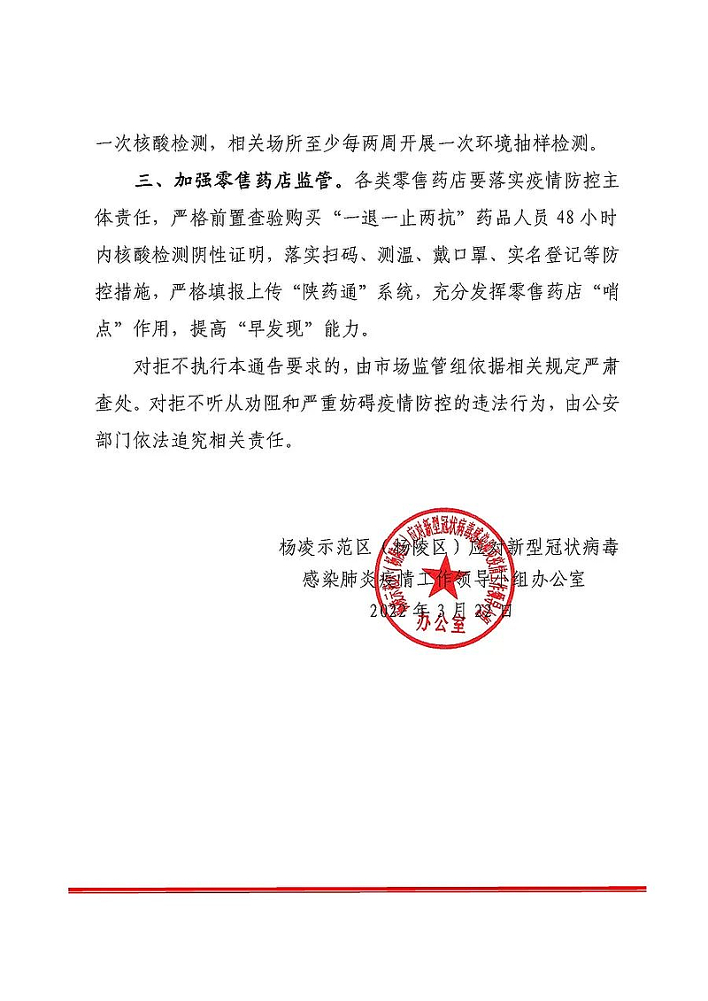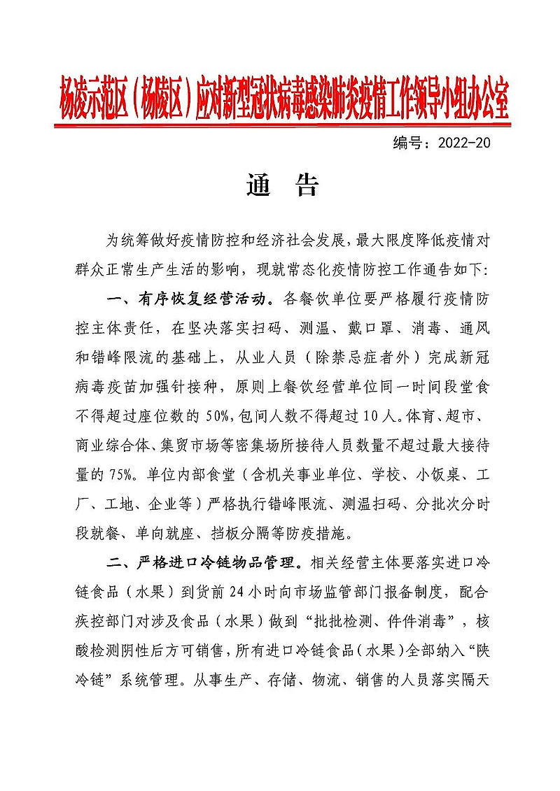 为统筹做好疫情防控和经济社会发展,最大限度降低疫情对群众正常生产生活的影响,杨凌示范区(杨陵区)应对新冠肺炎疫情工作领导小组办公室发布最新通告,对做好常态化疫情防控有关事项作出明确,即日起有序恢复经营活动,餐饮单位逐步恢复堂食。具体公告如下: