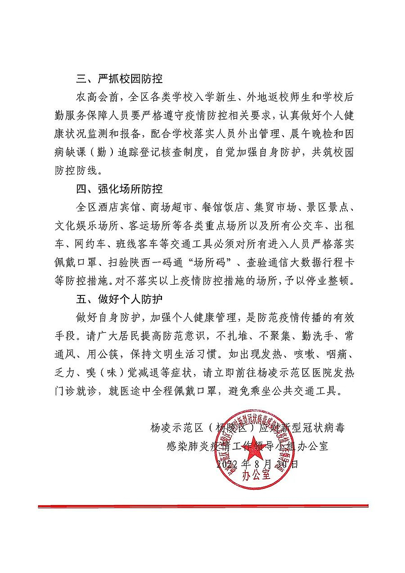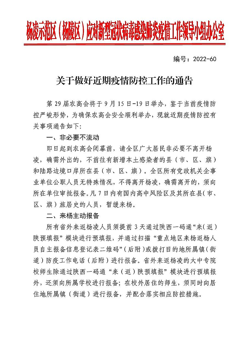 第29届中国杨凌农高会将于9月15日在杨凌开幕,鉴于当前疫情防控严峻形势,为了确保农高会安全顺利举办,杨凌示范区(杨陵区)应对新型冠状病毒感染肺炎疫情工作领导小组办公室发布最新《通告》(2022-60),进一步加强近期疫情防控工作。《通告》全文如下: