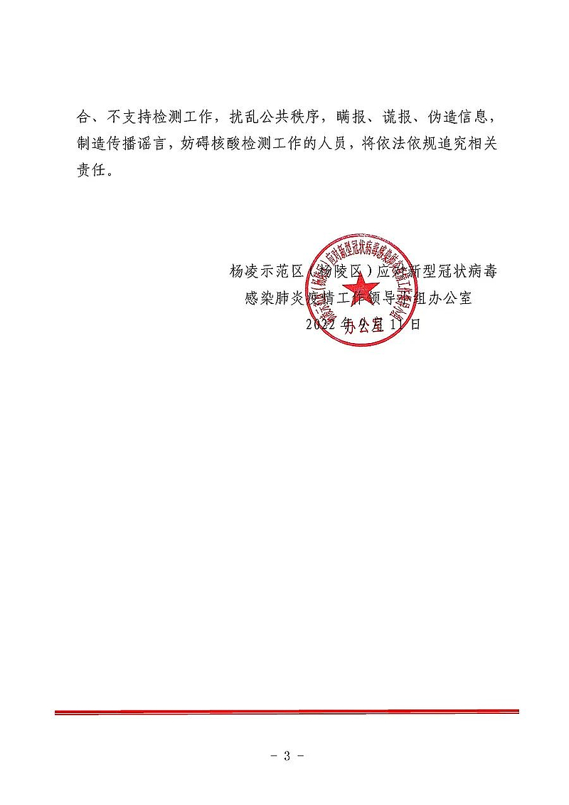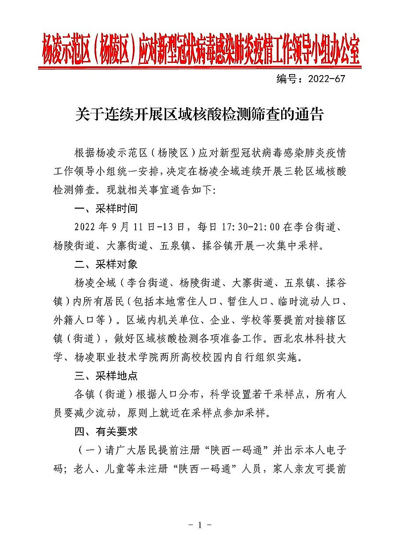 根据杨凌示范区(杨陵区)应对新型冠状病毒感染肺炎疫情工作领导小组统一安排,决定于9月11日-13日在杨凌全城连续开展三轮区域核酸检测筛查,具体通告如下: