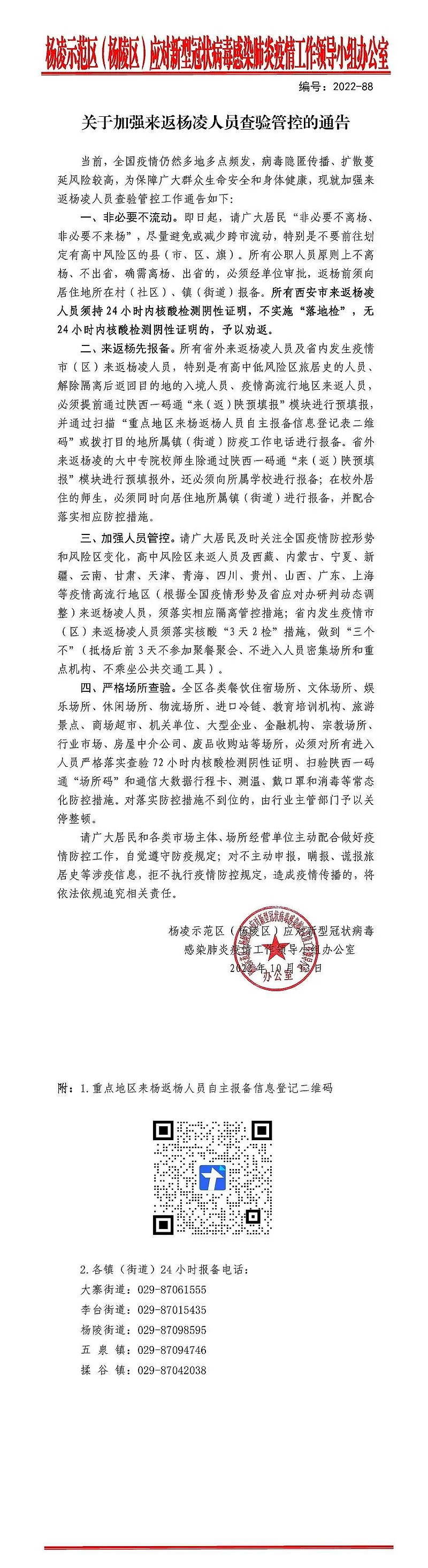 当前,全国疫情仍然多地多点频发,病毒隐匿传播,扩散蔓延风险较高,为保障广大人民群众生命安全和身体健康,杨凌示范区(杨陵区)应对新型冠状病毒感染肺炎疫情工作领导小组办公室发布最新《通告》(2022-88),进一步加强来返杨凌人员查验管控,通告全文如下: