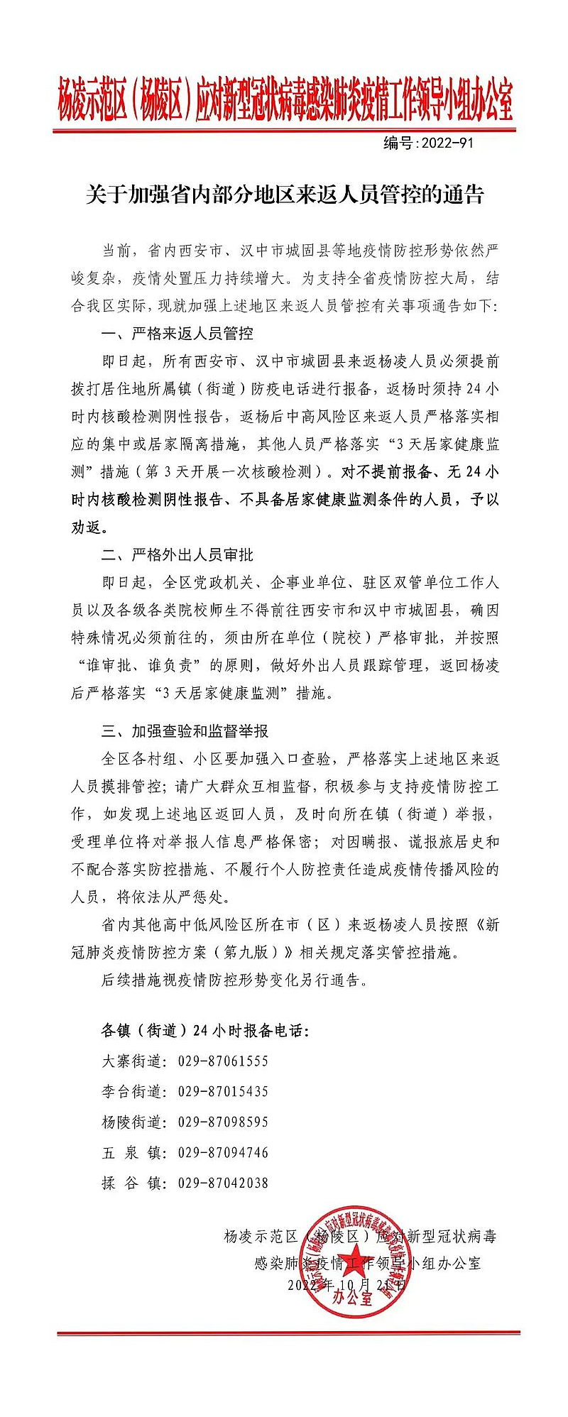 关于加强省内部分地区来返杨凌人员管控的通告
