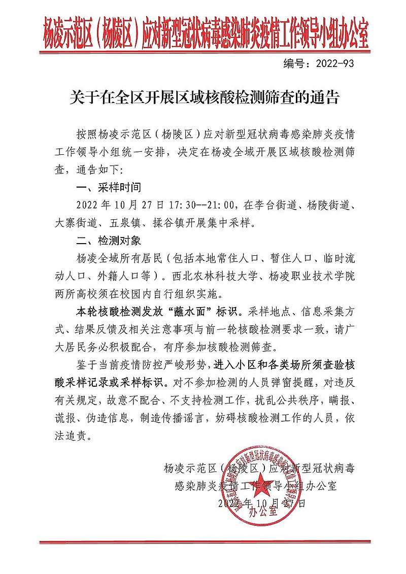 按照杨凌示范区(杨陵区)应对新型冠状病毒感染肺炎疫情工作领导小组统一安排,决定于10月27日17:30-21:00在杨凌全域开展区域核酸检测筛查,通告如下: