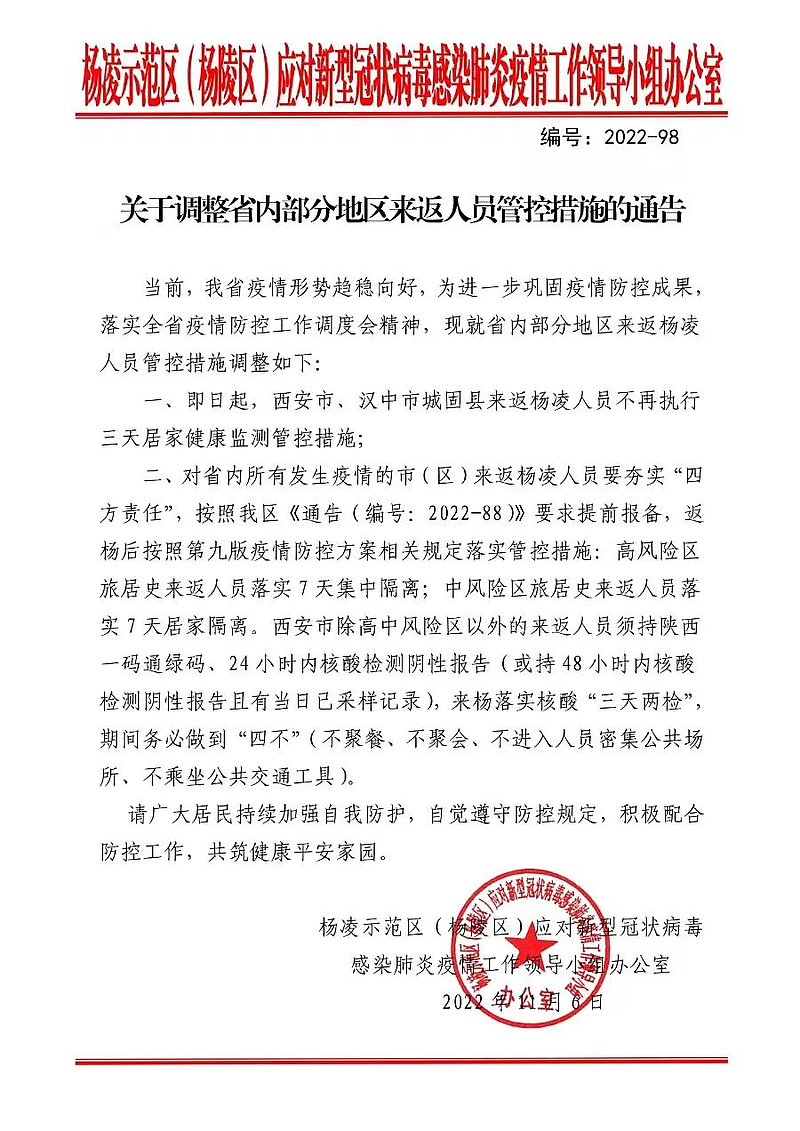 《通告》要求,对省内所有发生疫情的市(区)来返杨凌人员要夯实“四方责任”,按照2022-88号《通告》要求提前报备,返杨后按照第九版疫情防控方案相关规定落实管控措施:高风险区旅居史来返人员落实7天集中隔离;中风险区旅居史来返人员落实7天居家隔离,西安市除高中风险区来返人员必须持陕西一码通绿码、24小时内核酸检测阴性报告(或持48小时内核酸阴性报告且有当日核酸采样记录),来杨落实核酸“三天两检”,期间务必做到“四不”(不聚餐、不聚会、不进入人员密集公共场所、不乘坐公共交通工具)。
