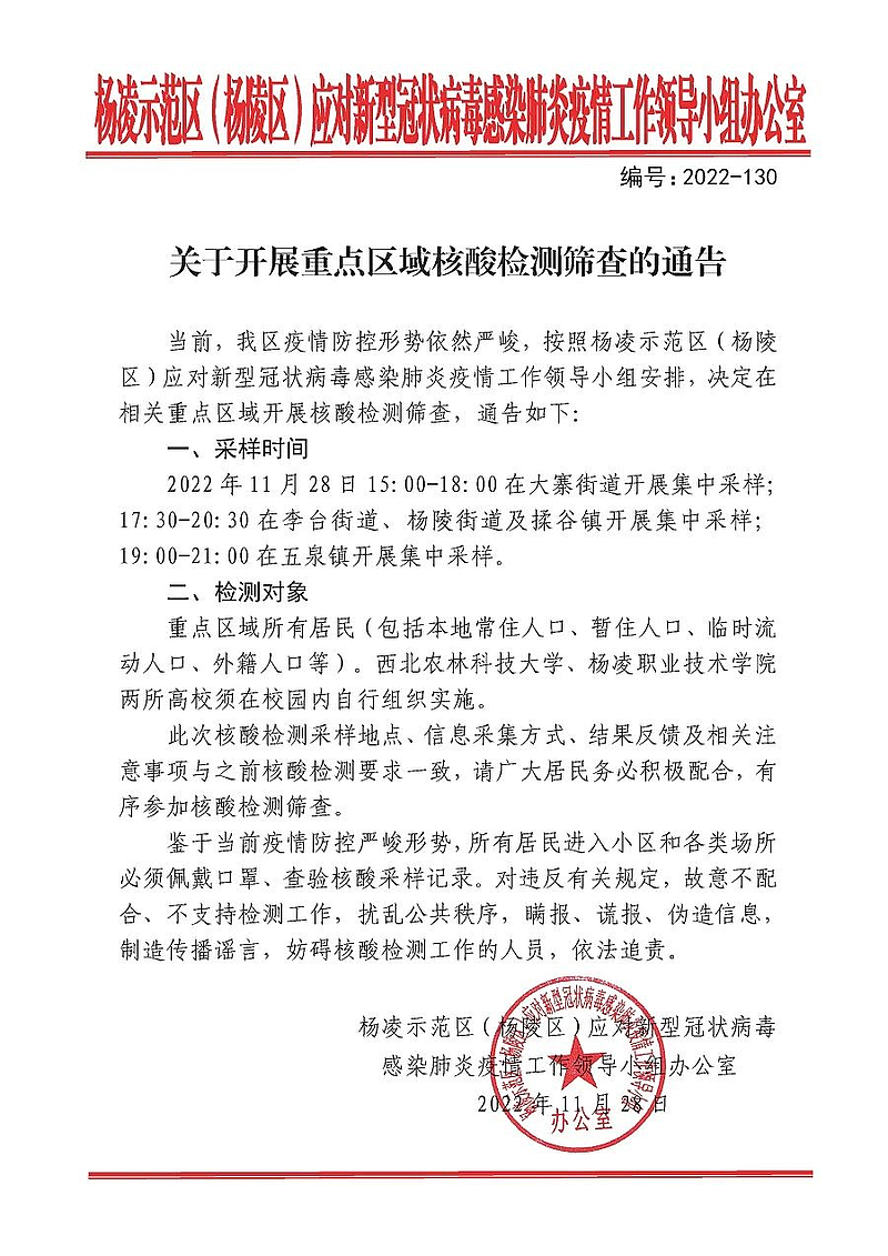 当前,杨凌疫情防控形势依然严峻,按照杨凌示范区(杨陵区)应对新型冠状病毒感染肺炎疫情工作领导小组安排,决定11月28日在相关重点区域开展核酸检测筛查。《通告》全文如下:
