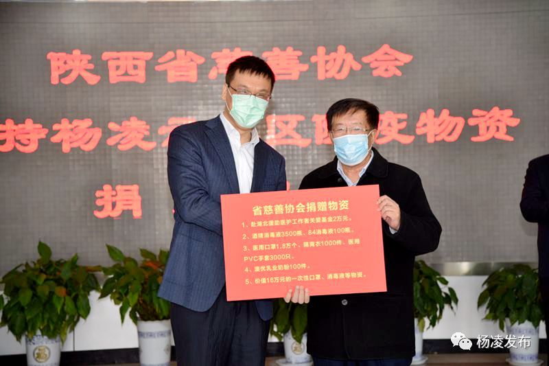 3月5日,省慈善协会在杨凌举行抗击新冠肺炎疫情防控物资捐赠仪式,为示范区捐赠了总价值71.993万元的防疫物资。示范区党工委书记、示范区应对疫情工作领导小组组长李婧出席捐赠仪式并向示范区医院发放受赠物资。省慈善协会常务副会长李荣杰代表省慈善协会捐赠并讲话,示范区党工委副书记、管委会常务副主任、示范区应对疫情工作领导小组组长李九红代表党工委管委会接受捐赠。示范区管委会副主任、示范区应对疫情工作领导小组副组长董立民致辞。省慈善协会秘书长卢宗让出席。示范区慈善协会会长刘怀省主持。