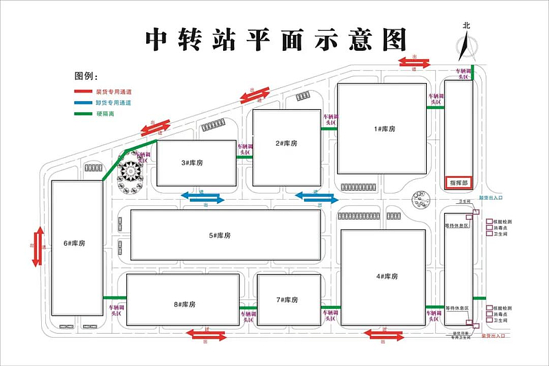 从中转站现场来看,分南北两个通道,北通道为来陕送货车辆通道,送货车辆和人员由北通道进入后原路返回;南通道为西安运货车辆与人员专用通道,西安司乘人员整个过程不下车,分界区进行硬隔离,南北两个通道均设有消杀、检测、卫生间等设施。同时,规范了应急物资物流作业流程、运输车辆防护、司乘人员防护等中转调运站内部作业流程。确保中转调运站安全、高效、优质运转,保障司机返回出车地顺畅无阻,中转调运站有序高效,确保应急物资在最短时间内送达指定地点。